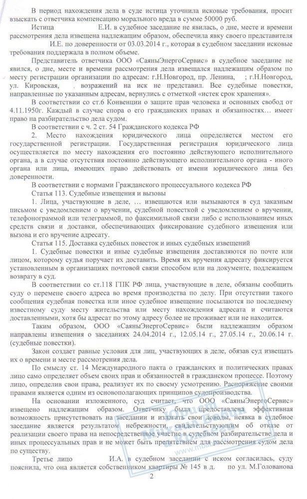 В результате деньги были взысканы с коммунальщиков, причём в сумме более 220 000 рублей, что в 2 раза превышает стоимость ремонта. Таким образом, Е.И. возмещены все неудобства, связанные с проливом квартиры, включая моральный вред.